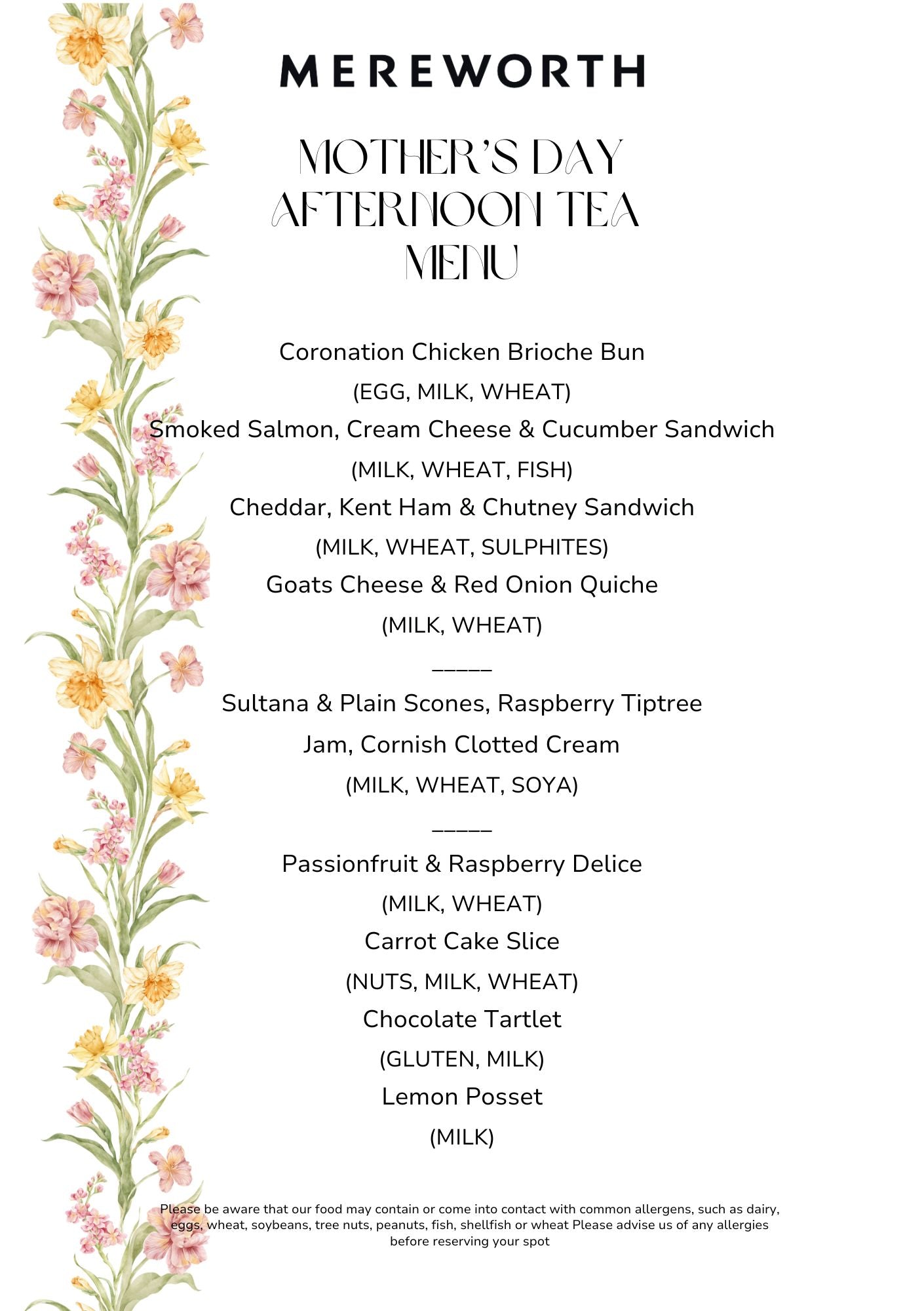 Dietary requirements must be emailed to events@mereworthwines.co.uk at time of booking.